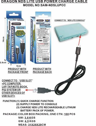 Now you can quickly charge your Nintendo DS Lite using an open USB port! The Nintendo DS Lite USB Power Cable connects to any PC Laptops, Desktops, Playstation 2 consoles and recharges your DS Lite battery. The USB Power Cable is compact in size and a must have for any DS Lite owners!